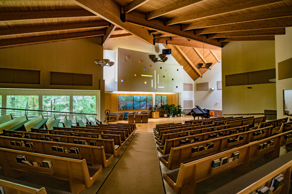 Cushioned seating for 350; Auditorium-sloped floors; High-quality sound system and piano options. Covered breezeway at entrance. High vaulted ceiling.